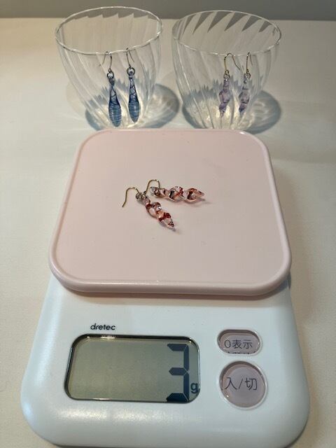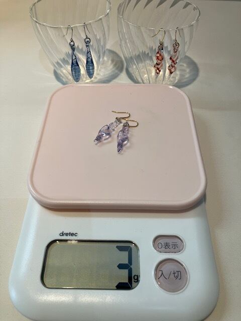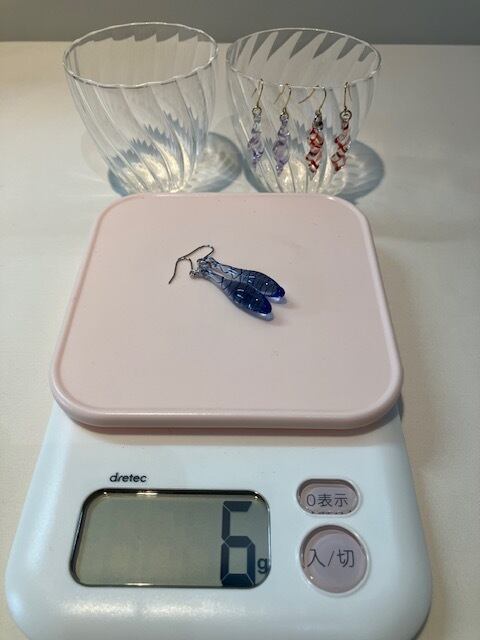 ①ガラスのアクセサリーにしては軽い 6gは重い方で、3~4gが多い